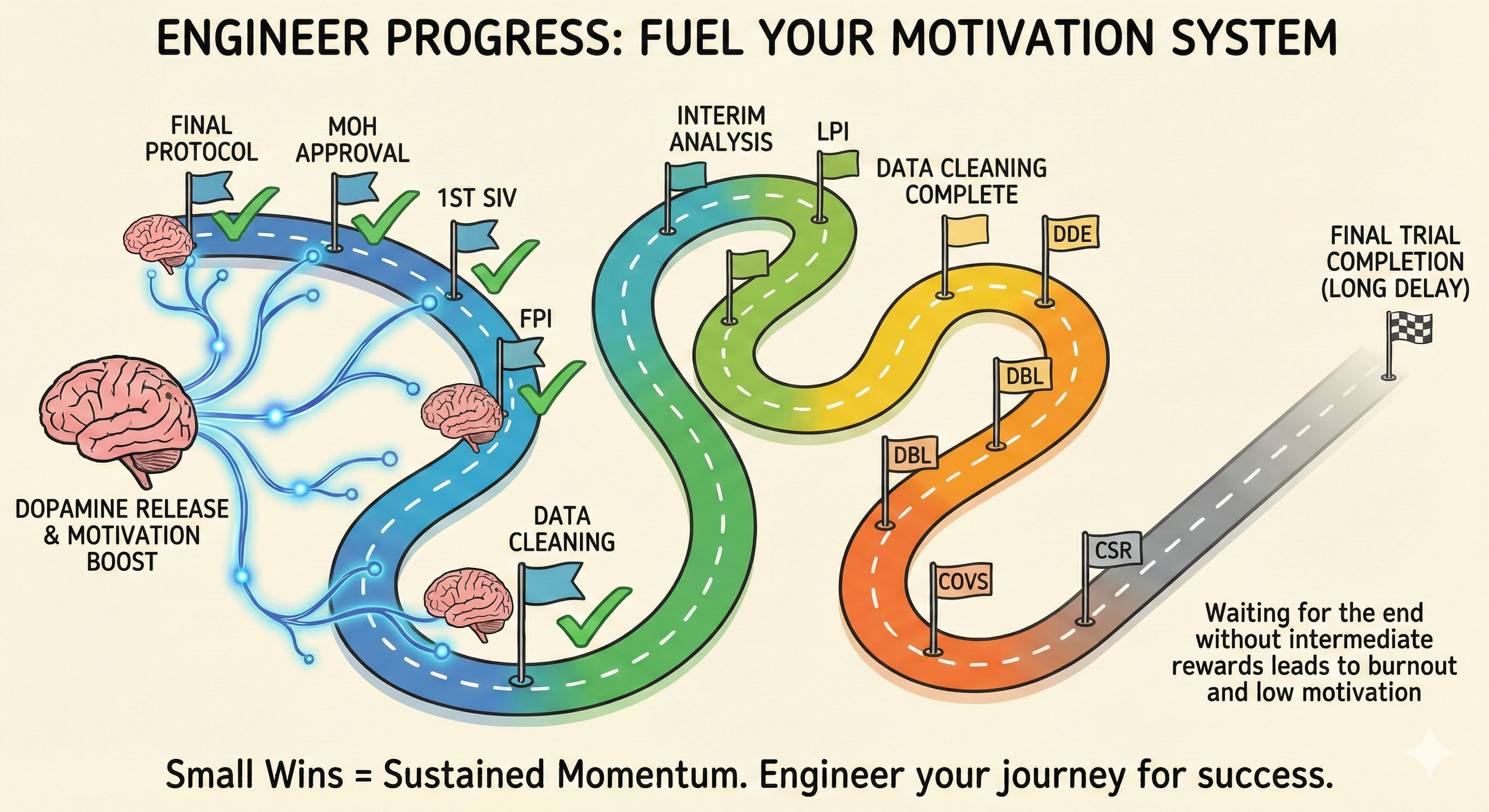 Teresa Amabile's research demonstrates that small, frequent wins trigger more sustained motivation than occasional big wins. Yet clinical research projects are structured around distant milestones that can be months apart. If you wait for "study complete" to feel accomplished, you'll burn out long before then.