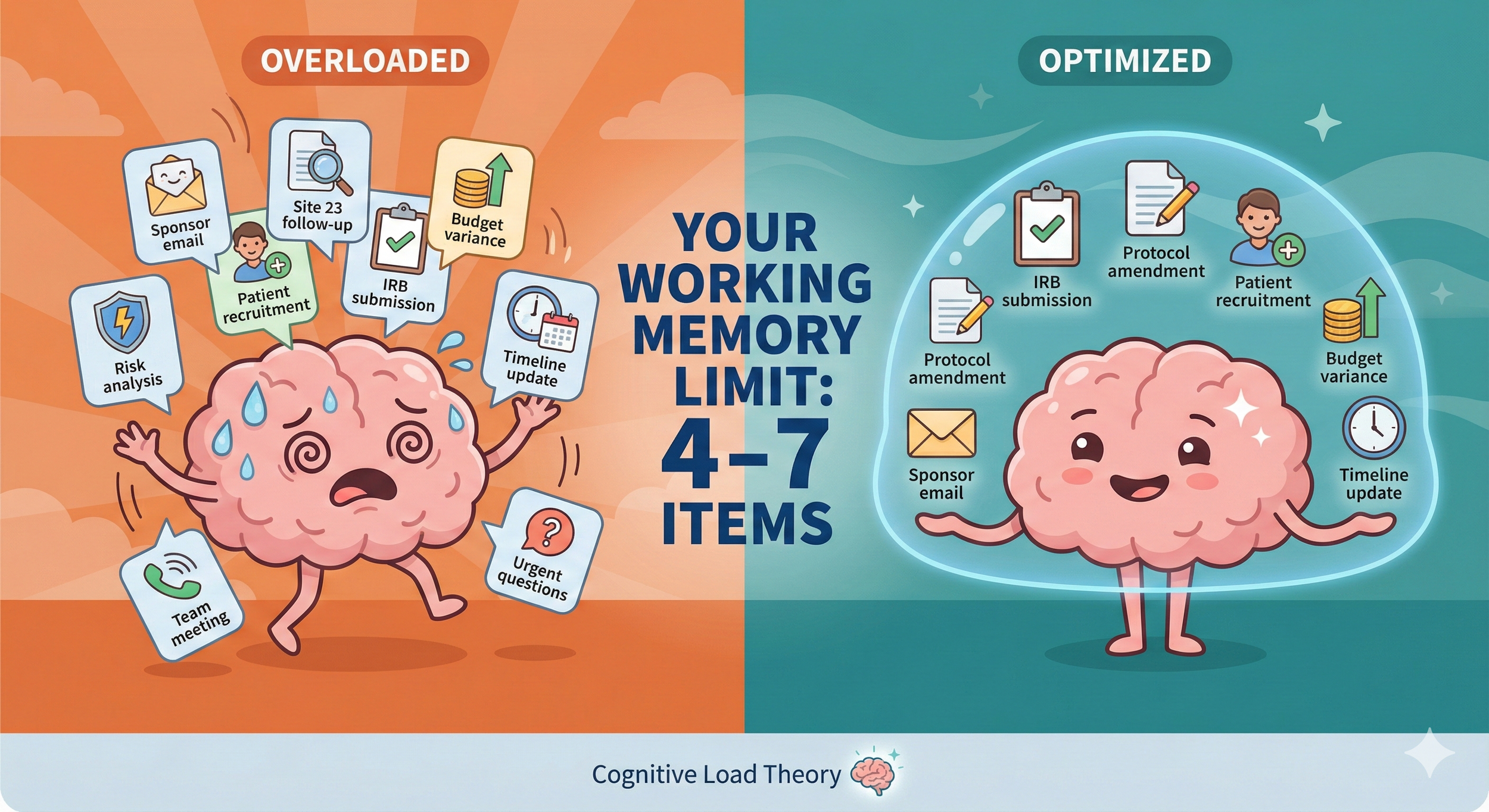 1. Intrinsic Load: The inherent complexity of the task itself. Understanding ICH-GCP requirements, navigating regulatory submissions, managing multi-country trials, etc. these are genuinely complex. This load is unavoidable in clinical research.